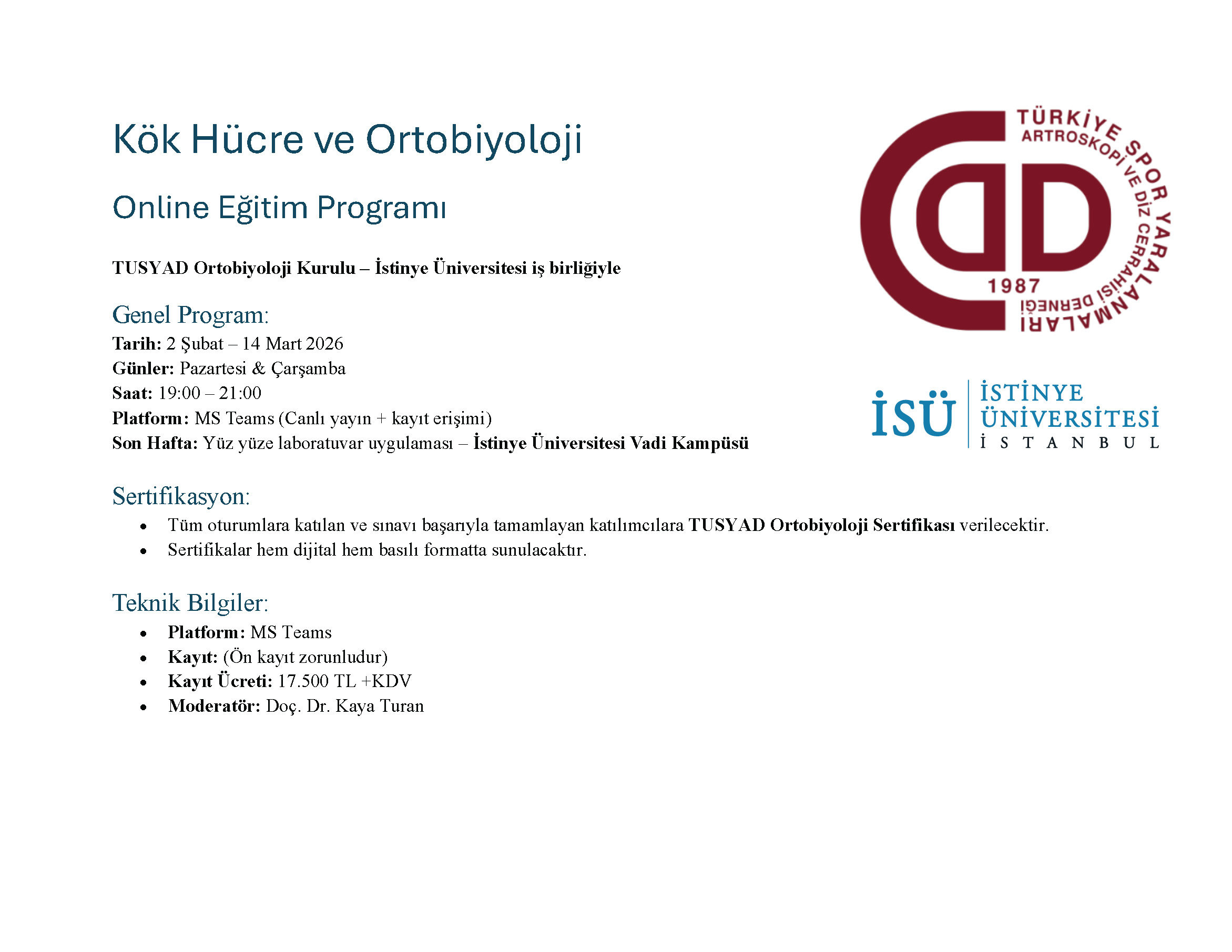 | 2. | 9 Şubat | Pazartesi | Mezenkimal Kök Hücreler (MSC): Kaynaklar, izolasyon, kültür koşulları, kalite kontrol ve regülasyonlar | Hakan Darıcı |