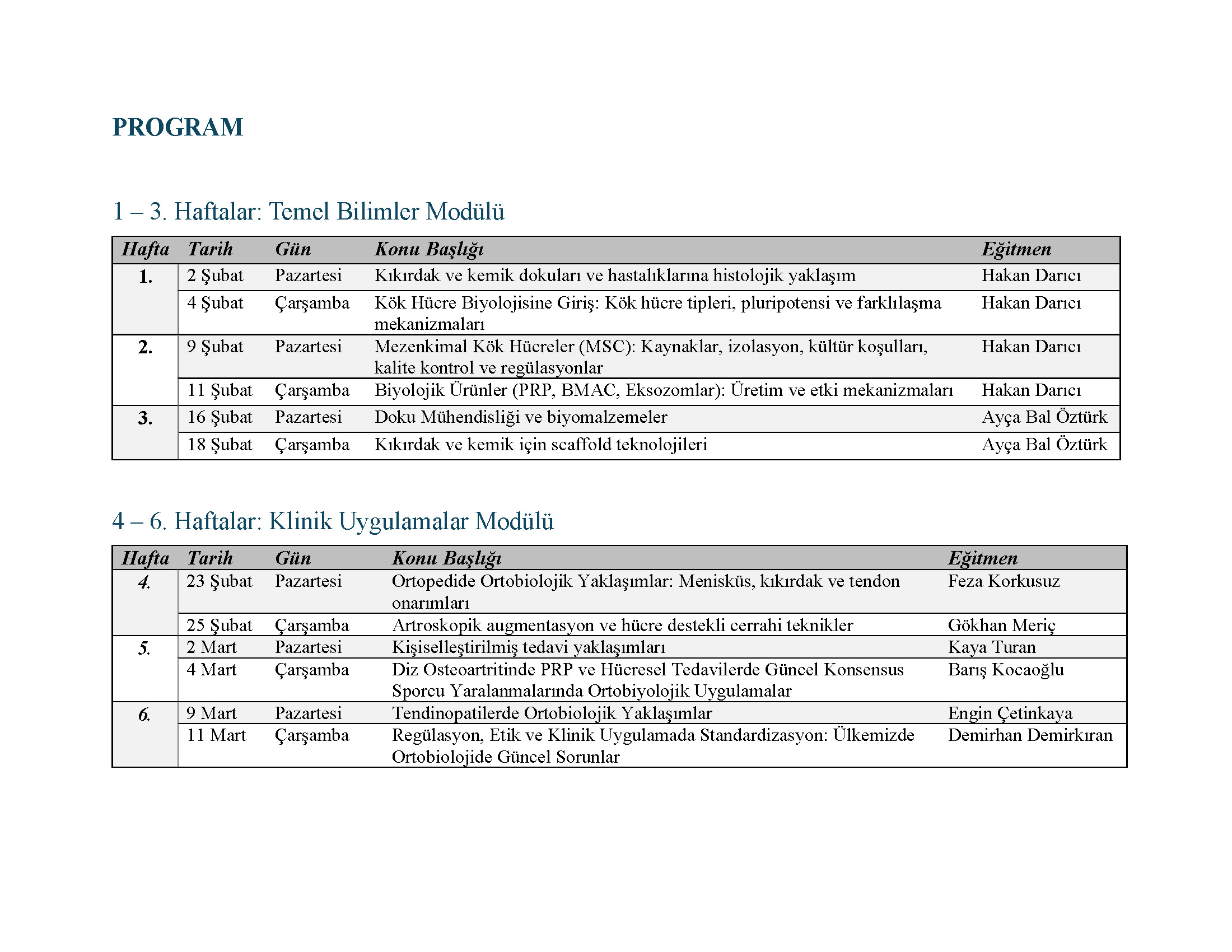 | 4. | 23 Şubat | Pazartesi | Ortopedide Ortobiolojik Yaklaşımlar: Menisküs, kıkırdak ve tendon onarımları | Feza Korkusuz |